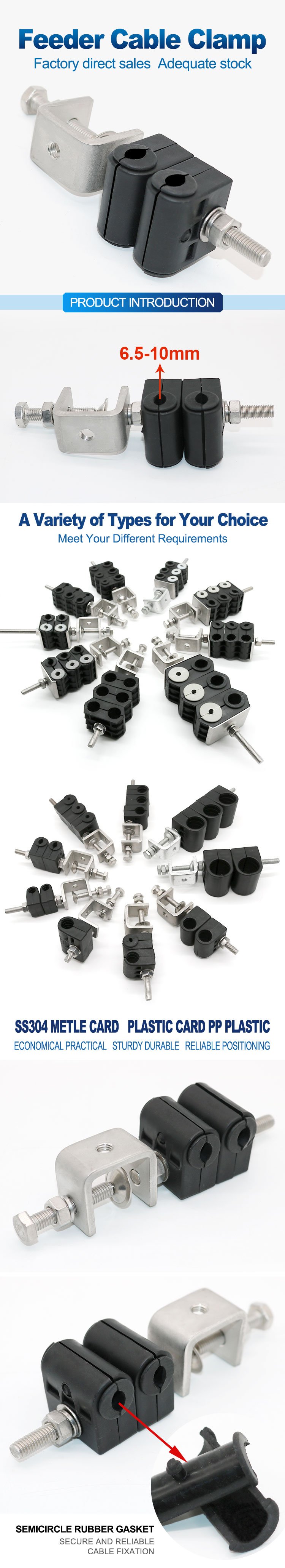 La abrazadera del cable alimentador se utiliza ampliamente en la instalación in situ para fijar los cables coaxidel alimentador a las torres base, las abrazaderas del cable alimentador proporcionan una forma eficiente de administrar y asegurar el sistema de instalación del alimentador.