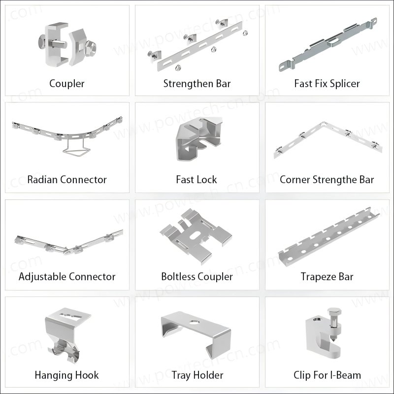 Estos accesorios facilitan la fácil instalación, ajuste y mantenimiento de las bandejde cables, asegurando el enrutamiento seguro y organizado de cables en diversos entornos.